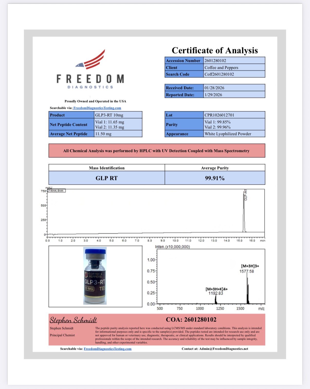Each vial is supplied as a lyophilized powder with documented purity exceeding 97% by HPLC, accompanied by complete analytical records including mass spectrometry data. Coffee & Pepper Peptides offers this product exclusively for use by qualified researchers in established laboratory settings. It is not intended for human or animal use.